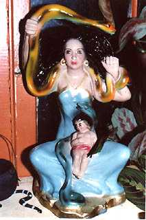 I found this goddess in a Santoria shop in Little Havana, a Cuban neighborhood in Miami, Florida. The owner told me that Santa Marta protects children. I later saw the same image as a larger fabric and sequined statue, also called Santa Marta, at a Voodou exhibit at the Met in New York. If you know more about her, tell me! A Santoria sells saintly supplies to Catholic/Voodou customers. Picture a small dusty shop with floor to ceiling shelves stuffed with good luck charms, tarot cards, herbs, oils, incense and candles for love or prosperity spells, Virgin Mary's and bloody crucifixes.